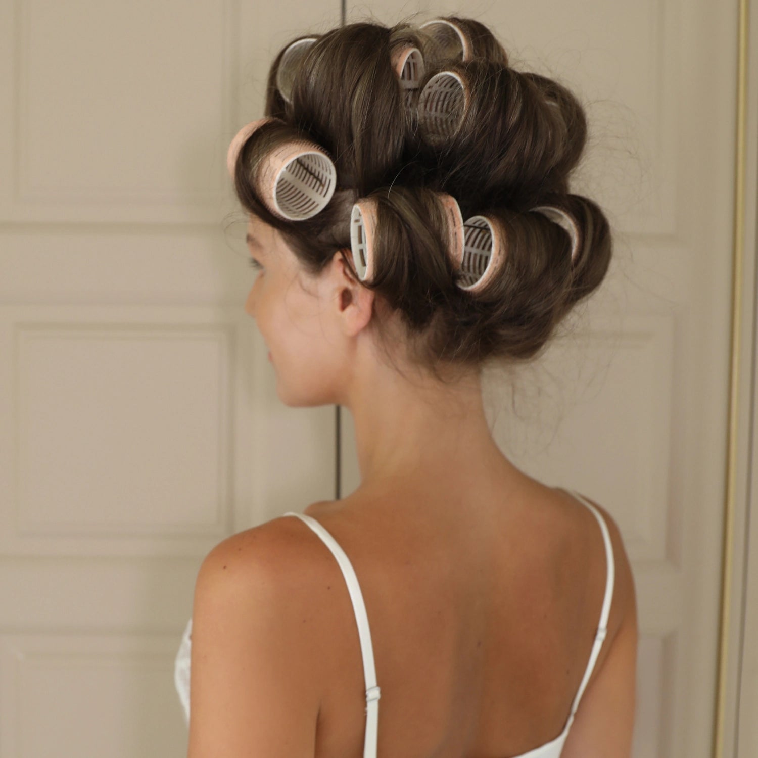 Varje sektion av håret sveps varsamt runt de mjuka sammet stavarna och täcks med en matchande satinmössa som både håller formen och skyddar håret.