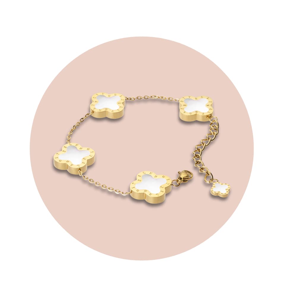 Vattentåligt armband med fyra motiv i form av en fyrklöver där de fyra löven tillsammans symboliserar tro, hopp, kärlek och lycka. Den klassiska men ändå lyxiga designen gör detta armband till ett perfekt val för både vardagsliv och festliga tillfällen. Oavsett tillfälle kommer detta armband tillföra elegans och lyfta din look.