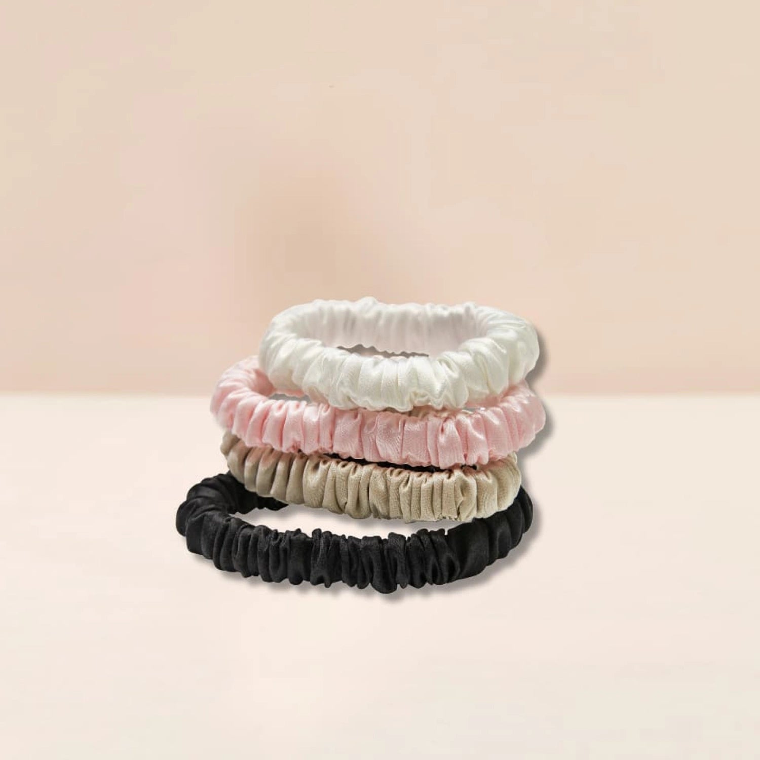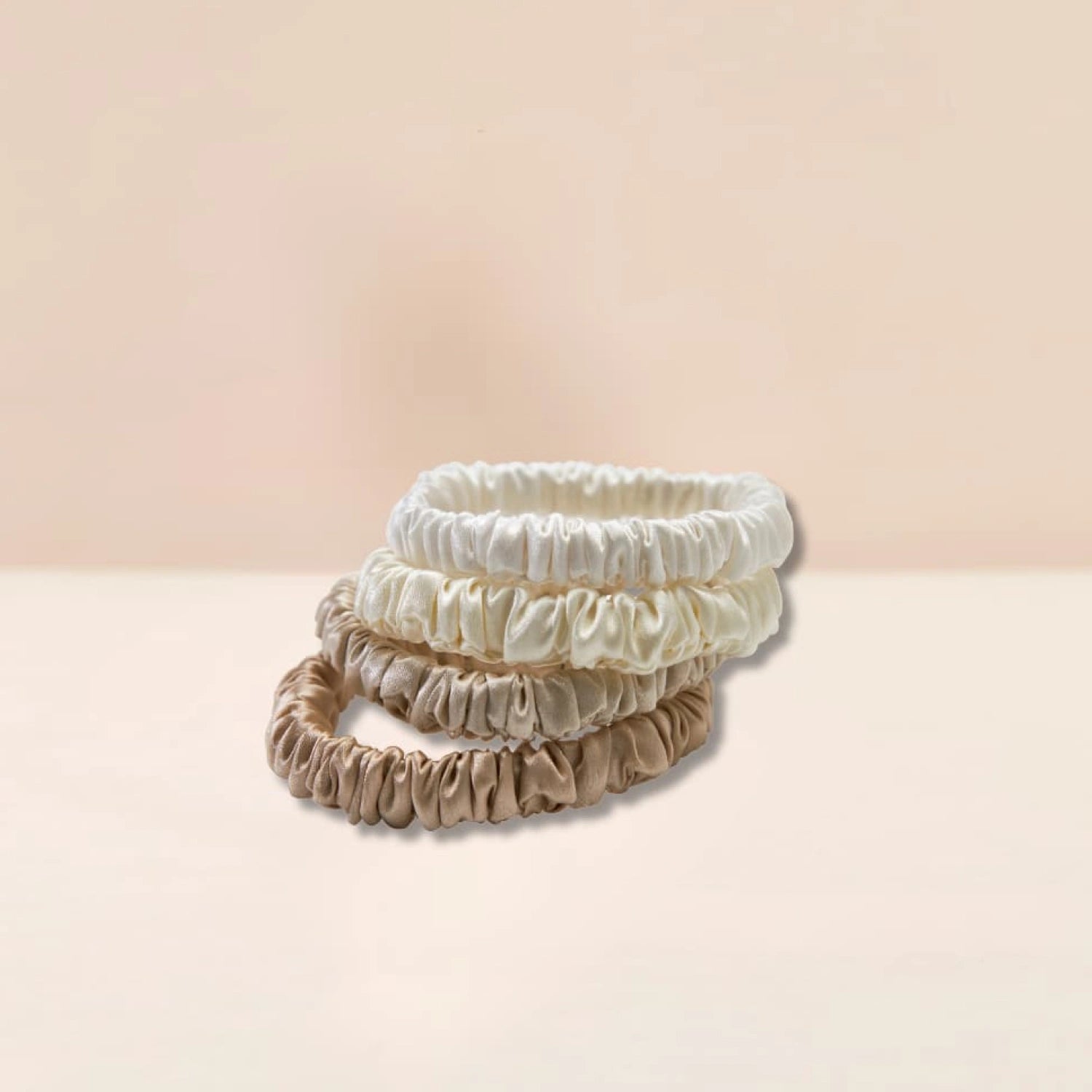 Vackra och tidlösa scrunchies tillverkade av 100 % mullbärssilke med en vikt på 22 momme, ett mått på silkets kvalitet och tjocklek. Ett smycke för håret som inte skaver mot det yttre lagret och som är skonsamt mot håret. Förhindrar märken och avtryck vid uppsättningar.